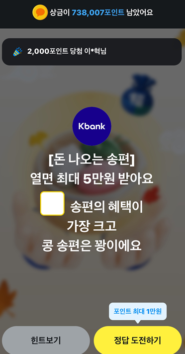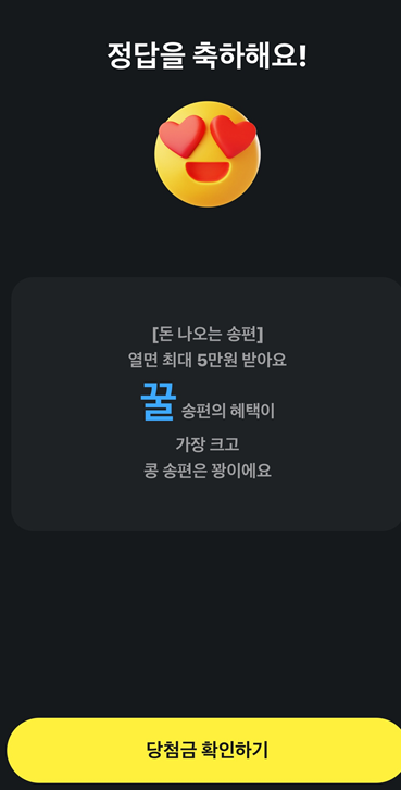 - 퀴즈에 성공하면 보통 카카오페이 포인트 또는 기타 리워드를 받을 수 있습니다.