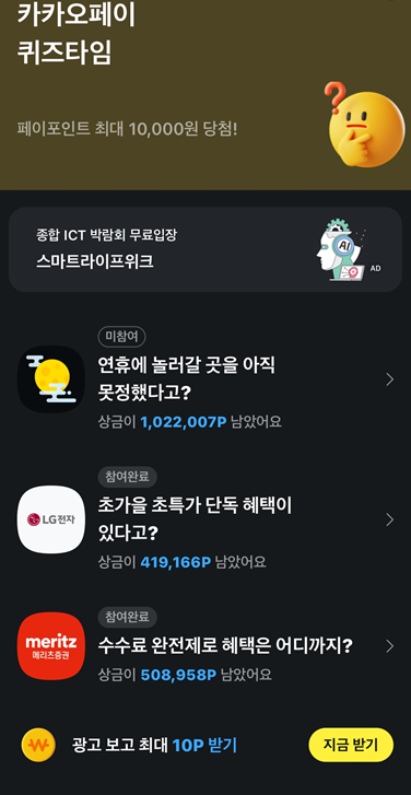 - 카카오톡 앱에서 '카카오페이' 서비스를 선택하거나, 퀴즈 관련 알림 메시지를 통해 접근할 수 있습니다.