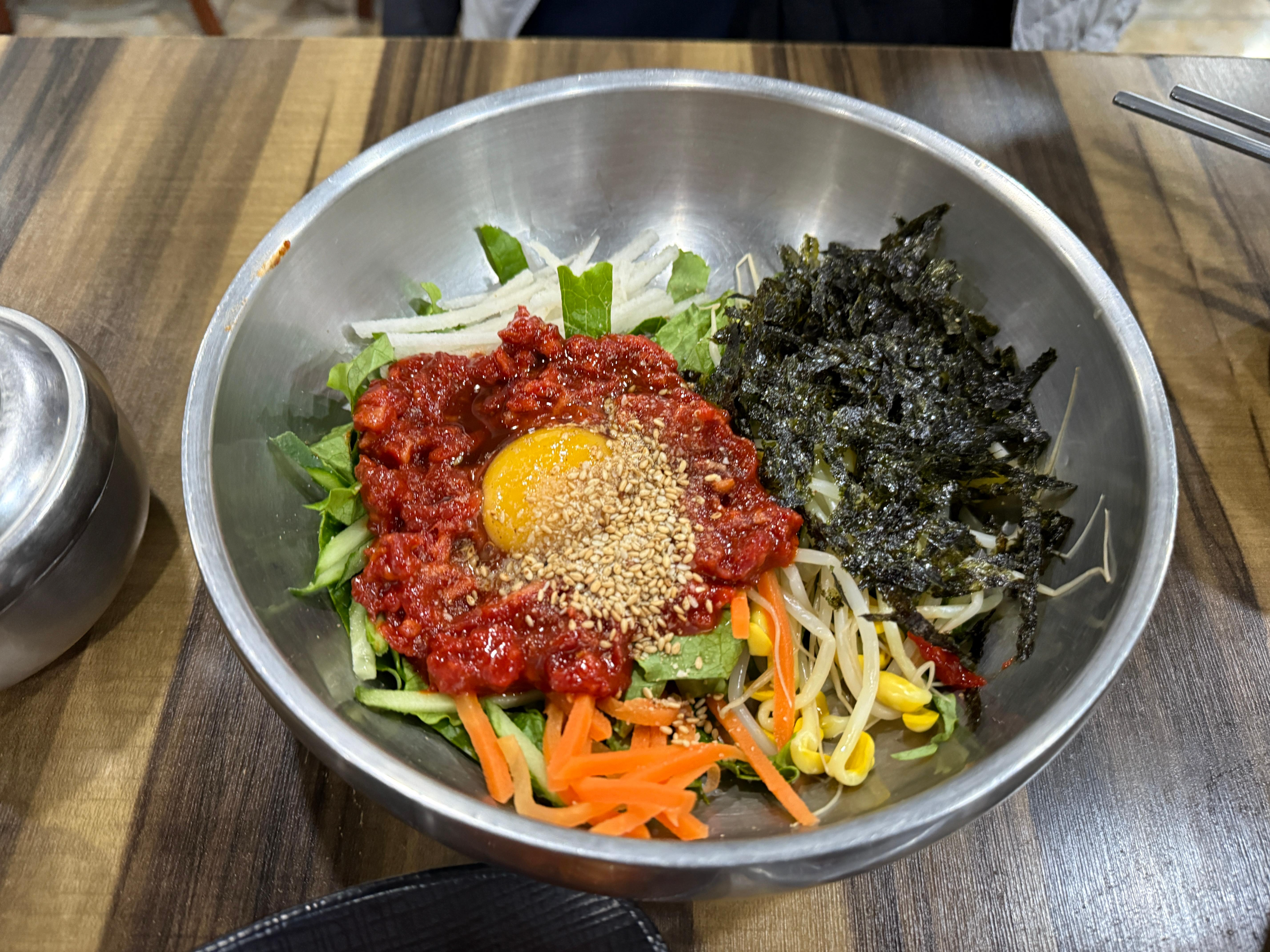한우탕과 함께 주문한 육회비빔밥(특) 입니다. 다른걸 떠나 역시나 육회의 양이 정말 많아 만족스럽습니다. 거의 밥반 육회 반 느낌?! 괜히 사람들이 많은게 아니더군요. 고기의 질과 양 모두 만족할 수 있는 육회비빔밥이었습니다.