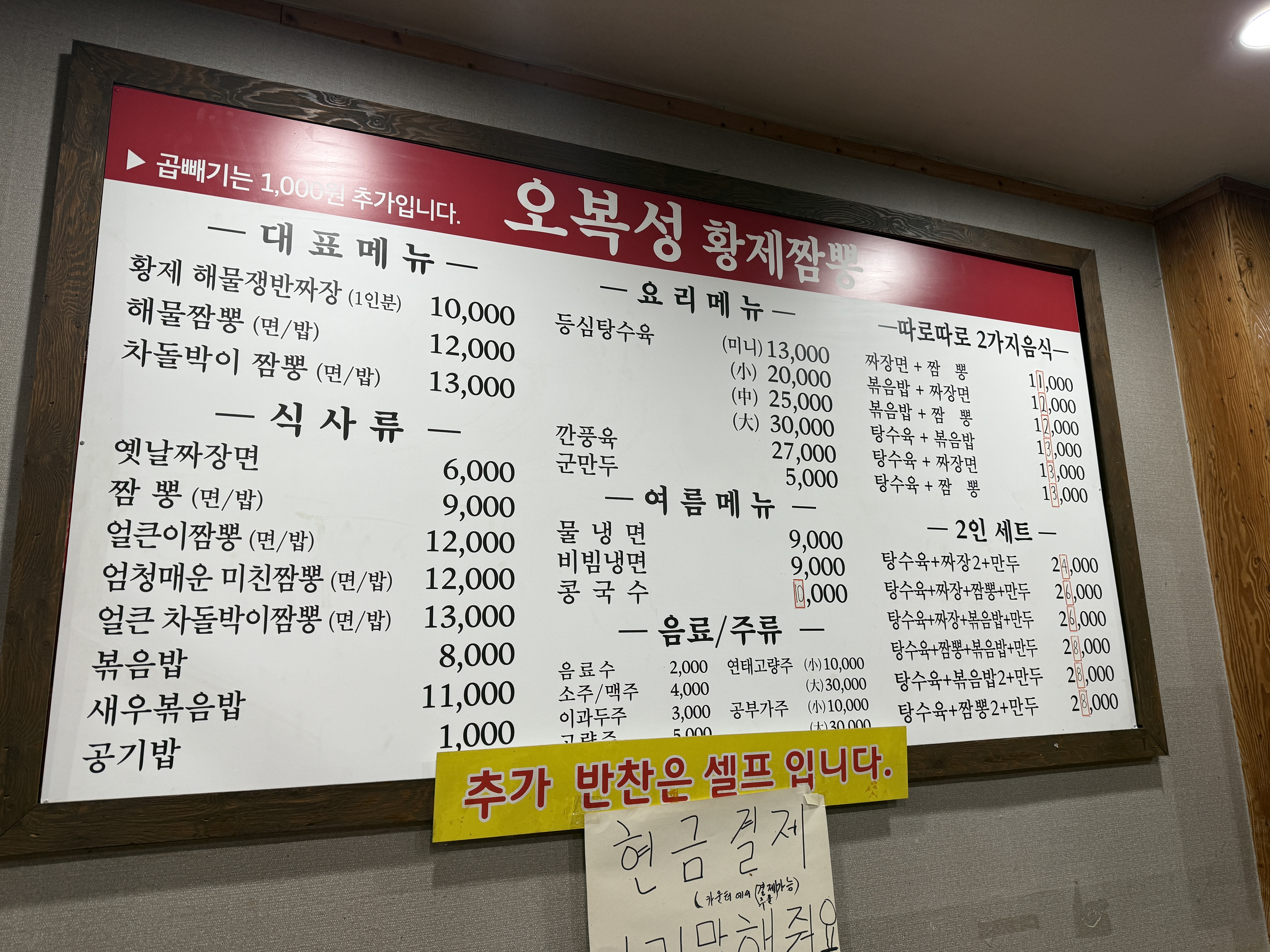 일단 해물짬뽕 또는 차돌박이 짬뽕을 드셔보시기 바란다. 둘이 방문한다면 황제해물쟁반짜장 + 짬뽕 조합을 추천한다. 일단 한입 먹을때 입안에 퍼지는 불향이 일품이다.