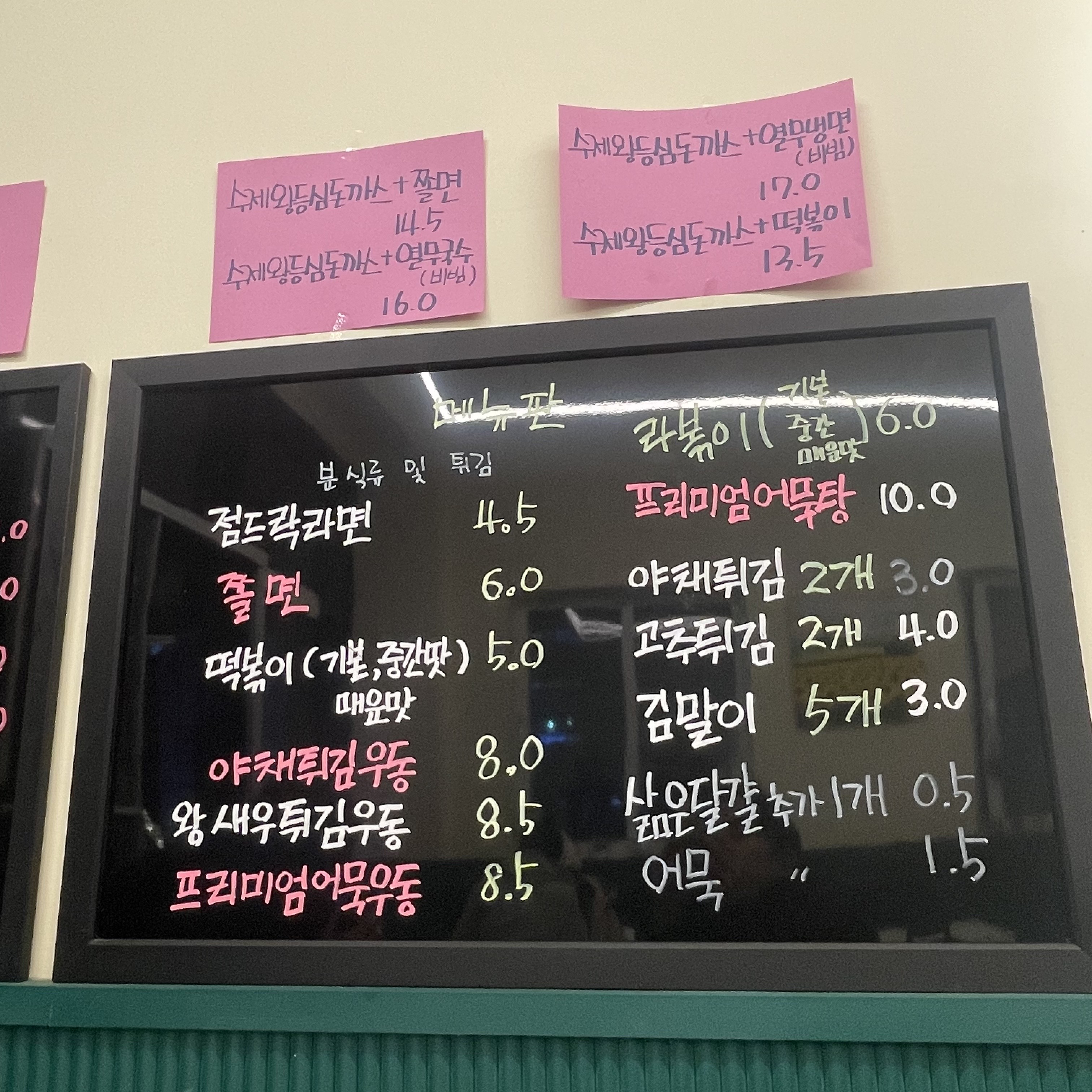 점드락은 다양한 분식 메뉴들과 함께 수제왕등심돈까스를 중심으로 세트메뉴들이 구성되어 있습니다. 라면, 쫄면, 떡볶이, 우동, 튀김, 김밥들이 다양한 종류로 준비되어 있습니다. 특히나 배를 든든하게 채워줄 돈까스를 중심으로 분식 메뉴들이 함께 구성된 세트메뉴들이 있어 좀 더 저렴하게 한 끼 식사와 분식을 먹을 수 있어 좋더라구요. 분식집에 가면 다 맛잇는 메뉴들이라 메뉴고르는데 너무 고민되더라구요. 대충 다른 테이블들을 둘러보니 돈까스를 중심으로 먹고싶은 분식메뉴를 주문하더라구요. 그래서 저희도 수제왕등심돈까스 + 떡볶이 메뉴를 주문했답니다!~ 분식은 일단 떡볶이지~!!!