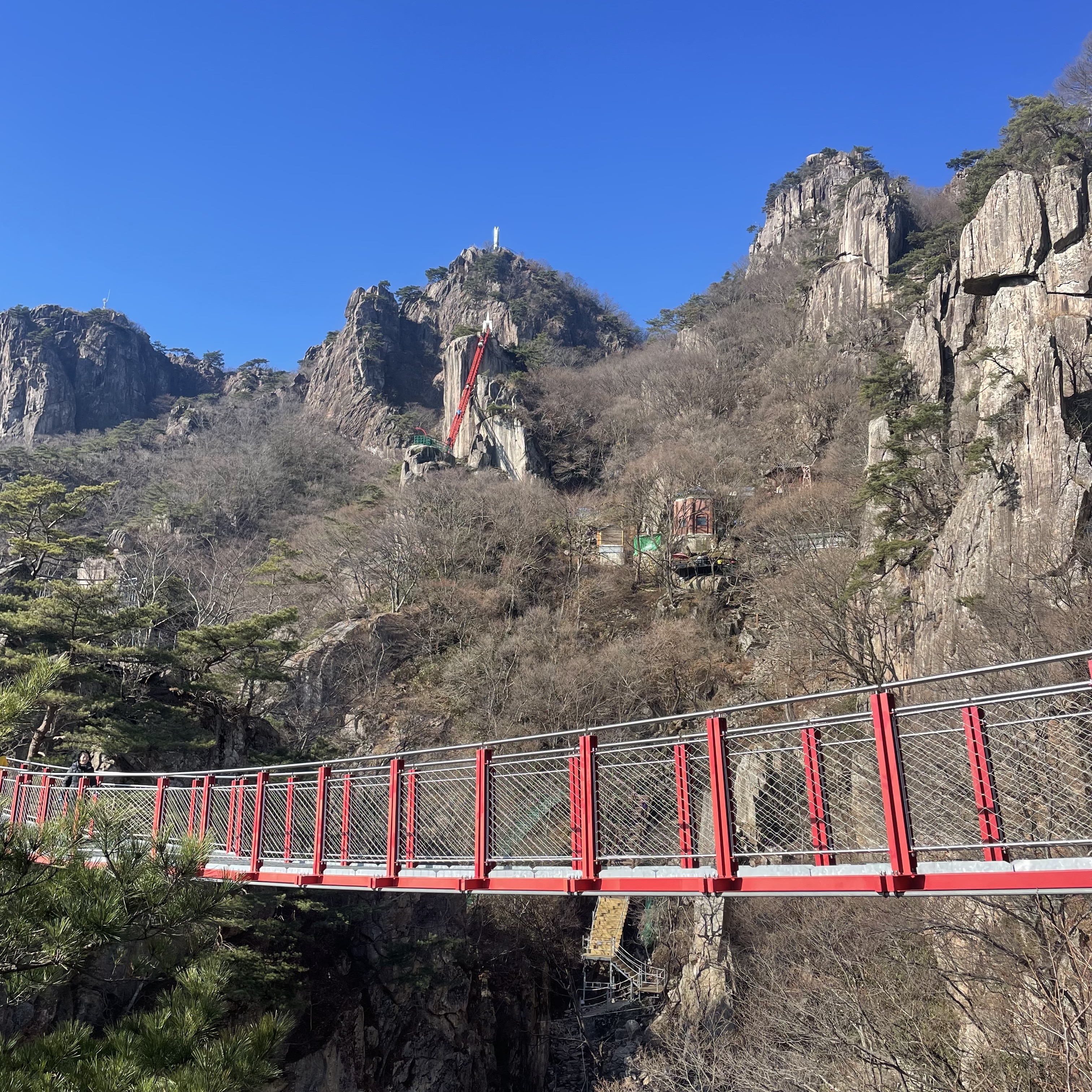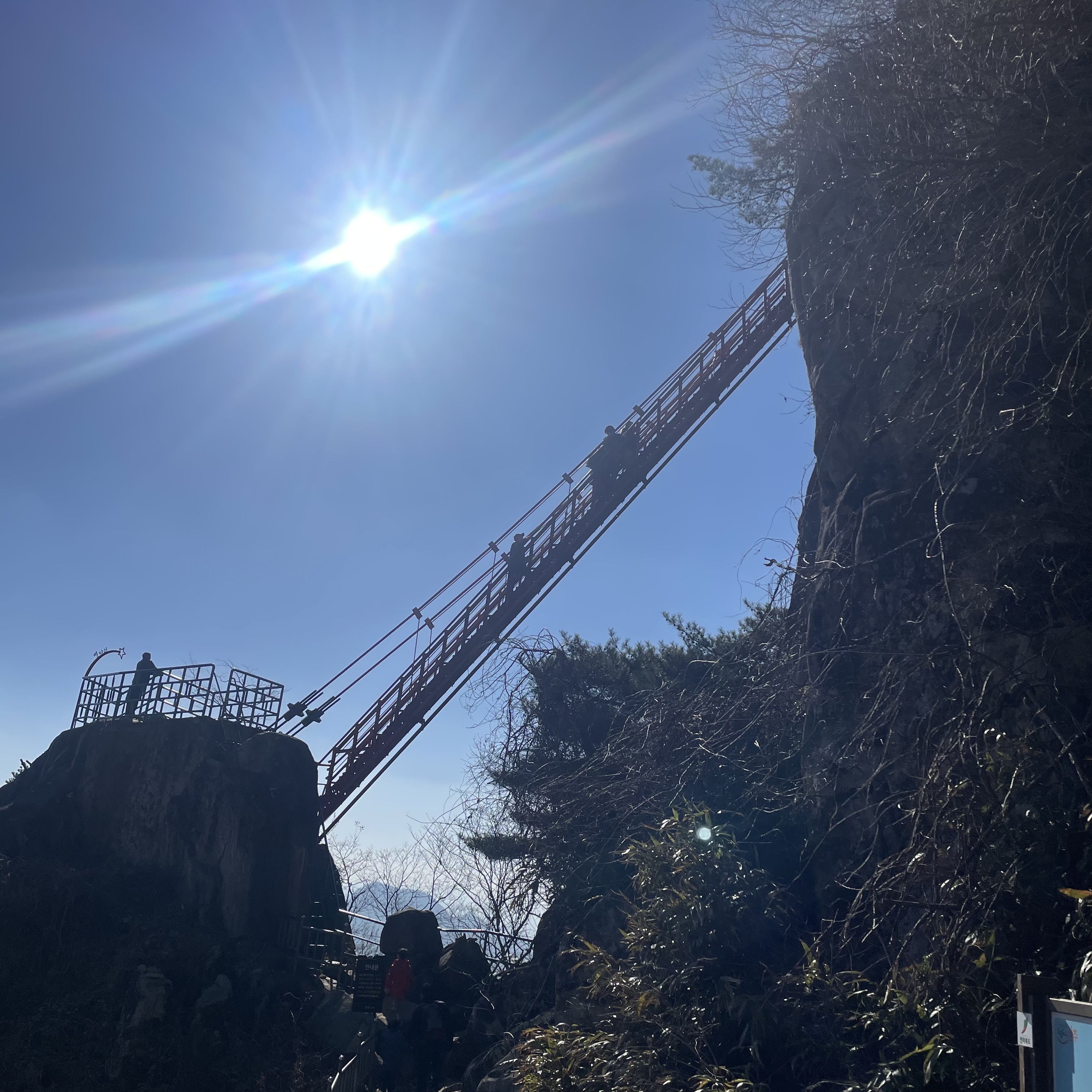 이제부터는 본격적으로 등산시작입니다. 대둔산은 대부분 계단으로 이루어져 있다는 점 참고하시기 바랍니다. 상당히 가파른 경사의 계단이 마천대에 도착할때까지 계속 이어집니다. 중간중간 재미있는 익스트림 코스가 있는데 그 첫번째가 출렁다리 입니다. 이정도는 대부분 갈 수 있을 겁니다. 조금 흔들리기는 하지만 이겨낼 수 있어요!!