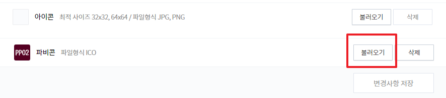 블로그 화면에서 아래와 같이 파비콘을 올리는 메뉴가 있습니다. 불러오기를 클릭하여 ICO파일을 선택하면 끝!!