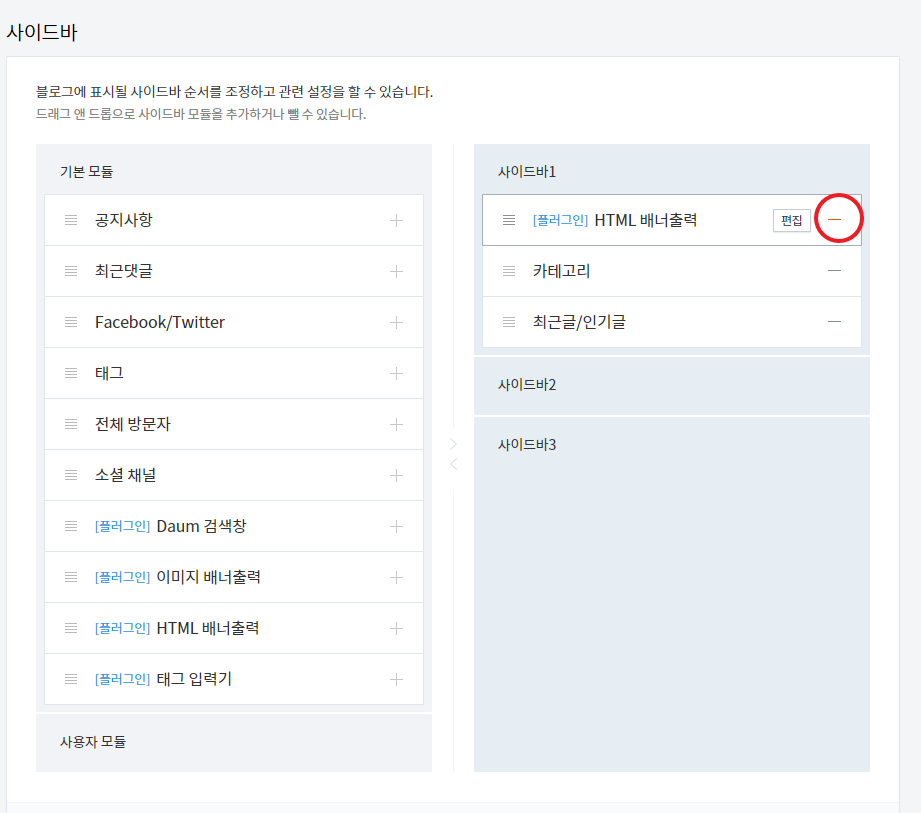 이제 사이드바 메뉴에 가셔서 HTML 배너출력 모듈을 활성화 시켜줘야 합니다. 사이드바에 들어가서 HTML 배너출력 모듈의 '+'를 클릭하여 자신이 원하는 사이드바에 활성화를 시켜줍니다.