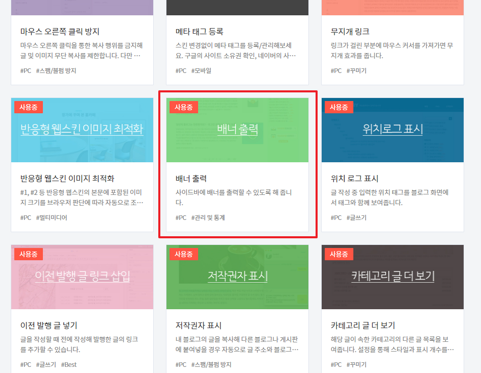 구글번역기를 설치하기 위해서는 플러그인의 배너출력을 사용해야 합니다. 관리자 모드 메뉴에서 플러그인을 선택하여 배너출력을 적용시켜줍니다. 그럼 오른쪽 사진과 같이 배너출력에 사용중이란 딱지가 뜨면 준비 끝!!