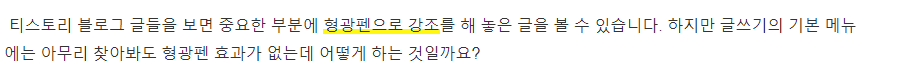 티스토리 블로그 글들을 보면 중요한 부분에 형광펜으로 강조를 해 놓은 글을 볼 수 있습니다. 하지만 글쓰기의 기본 메뉴에는 아무리 찾아봐도 형광펜 효과가 없는데 어떻게 하는 것일까요? 자신의 글을 좀 더 가독성 있게 만들어 주는 형광펜 효과를 넣는 방법을 알려드리겠습니다.
