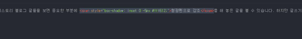HTML 모드에서 형광펜 코드를 자신이 강조하고 싶은 부분에 넣어주기만 하면 끝입니다.