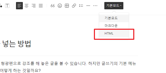 티스토리에 형광펜 효과를 넣기 위해서는 글쓰기의 HTML 모드에서 형광펜 효과 코드를 입력해 주셔야 합니다.
