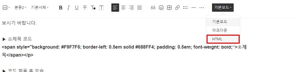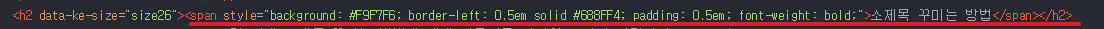 소제목 부분에 코드를 입력해 주시면 됩니다. 아래와 같이 '소제목 꾸미는 방법'을 띠지 형식으로 바꾸고 싶다면 앞부분에 코드입력 후 뒤 부분에 </span>으로 마무리해주시면 됩니다. 쉽죠?