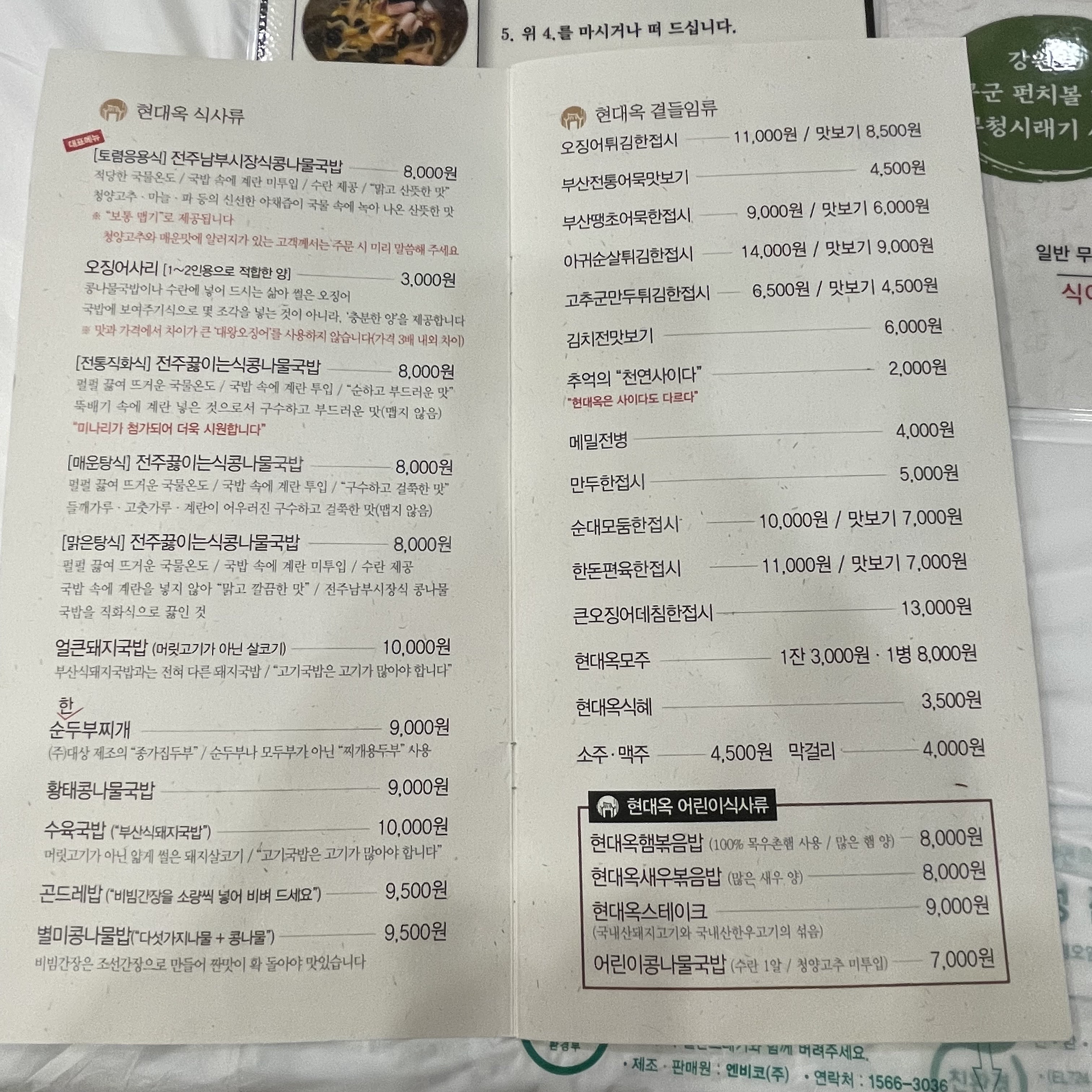 현대옥 본점에는 다른 체인점에 비해 다양한 메뉴를 맛 볼 수 있습니다. 콩나물국밥 종류만 해도 토럼식, 전통직화식, 매운탕식, 맑은탕식이 있더라구요. 보통 현대옥 분점에 가면 남부시장식(토럼식)과 끓이는 식(직화식)만 있답니다. 현대옥에 처음 방문하시는 분들이라면 오리지날 남부시장식은 꼭 맛보시기 바랍니다. 그 외 두부찌개, 황태콩나물국밥, 돼지국밥, 곤드레밥, 별미콩나물밥이 있습니다. Tip. 콩나물 국밥을 먹을때는 꼭 오징어사리를 추가해 드시기 바랍니다.