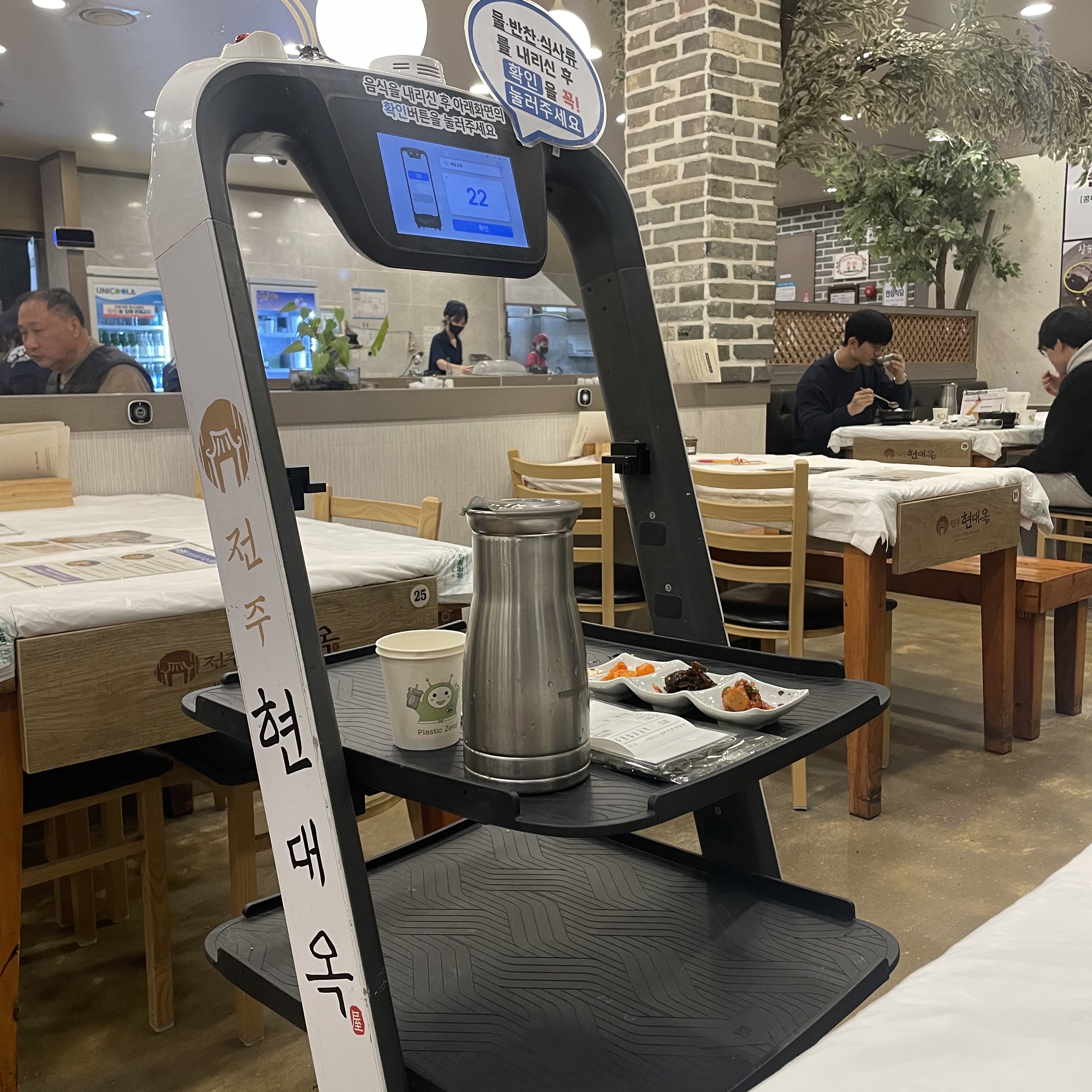 저희는 남부시장식 하나와 매운탕 하나를 주문했답니다. 열일하는 로봇이 기본 찬들을 가지고 옵니다. 콩나물 국밥은 필수 반찬 김, 그리고 깍두기, 오징어젓갈이 나옵니다. 여긴 특이하게 깻잎 무침이 나오네요. ㅎㅎ