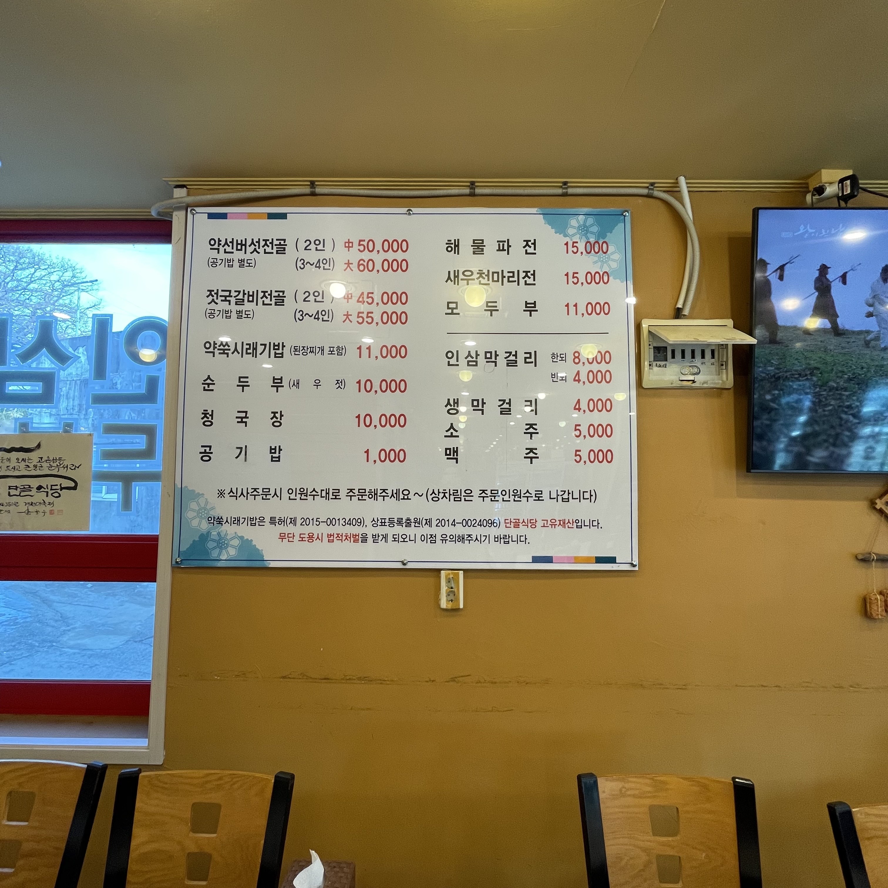일단 메뉴판을 한번 볼까요? 눈에 띄는 메뉴들이 많습니다. 젓국갈비전골부터 특허까지 냈다는 약쑥시래기밥, 새우천마리전등... 저희는 젓국갈비전골 2인과 약쑥 시래기밥을 주문해 보았습니다. 강화도에 왔으니 강화도에서만 먹을 수 있는 음식들!!