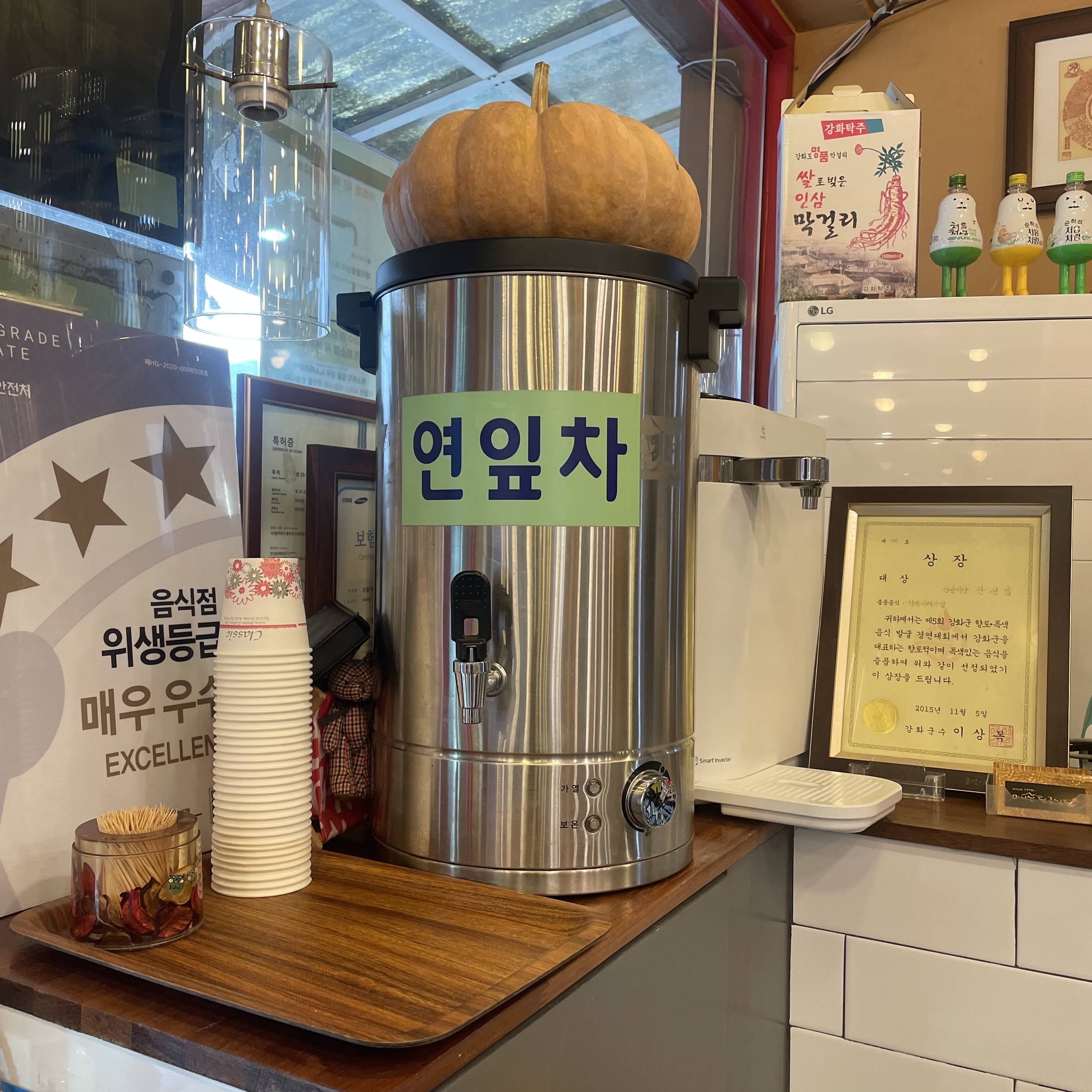 정신없는 외관에 비해 내부는 상당히 깔끔하고 차분합니다.^^ 테이블에 앉으니 사장님께서 따뜻한 연잎차가 준비되어 있다며 추천해 주시더라구요. 따뜻한 연잎차에 몸을 녹이며 메뉴판을 살펴보았습니다.