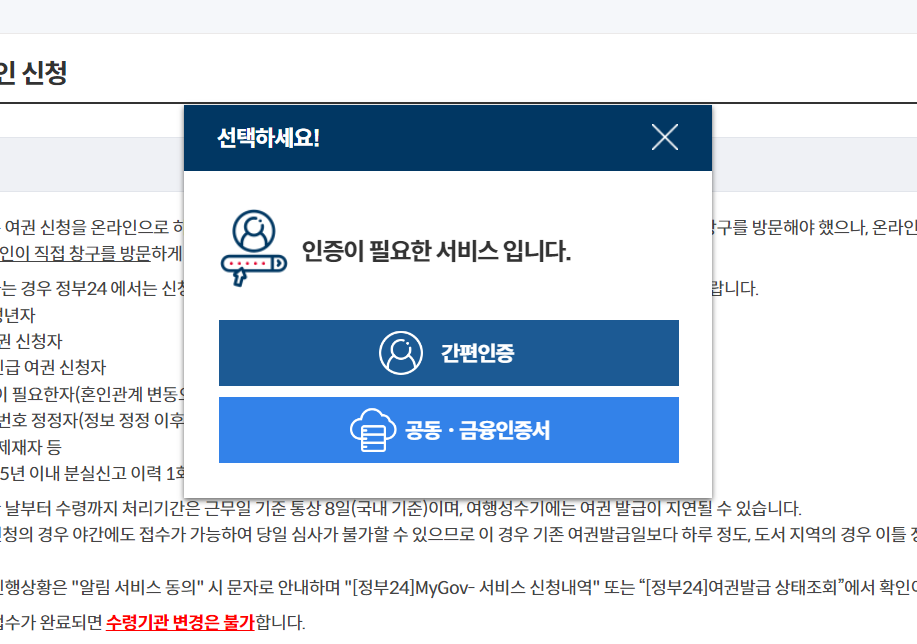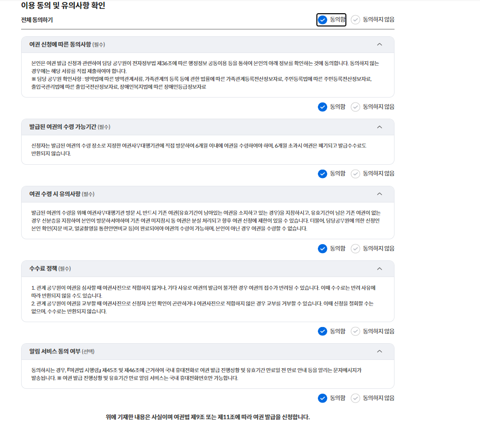 ▶ 동의 - 여권 기간 및 여권 면수 선택 - 수령기관 선택