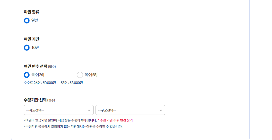 ▶ 동의 - 여권 기간 및 여권 면수 선택 - 수령기관 선택