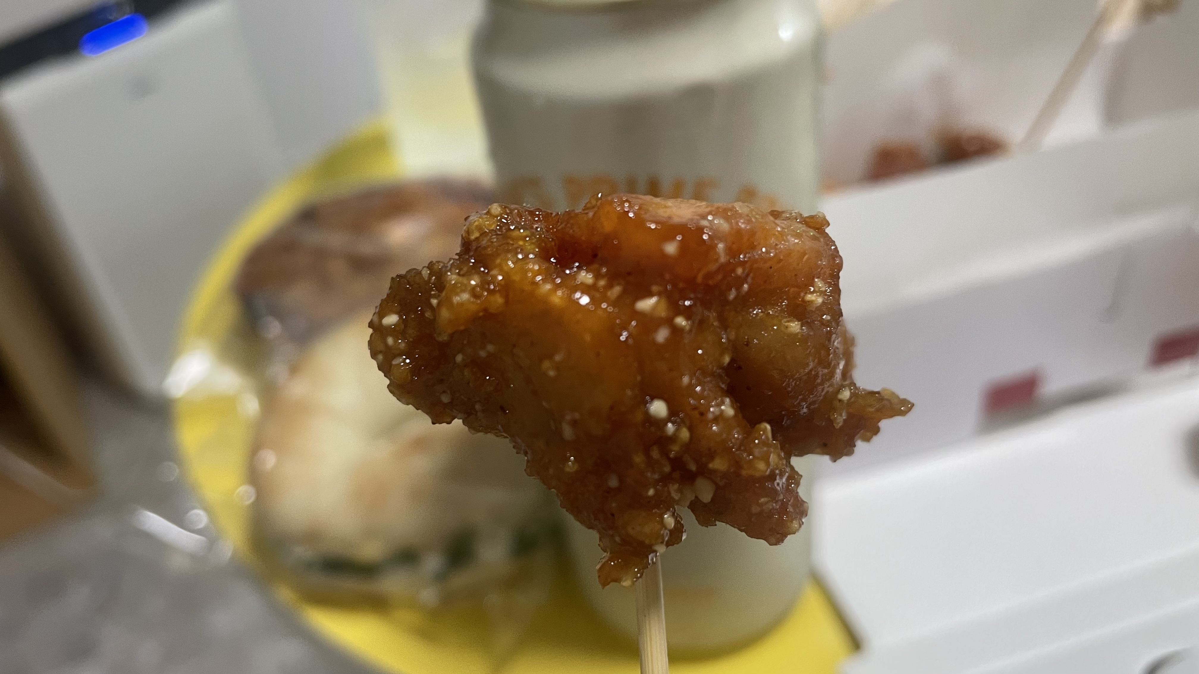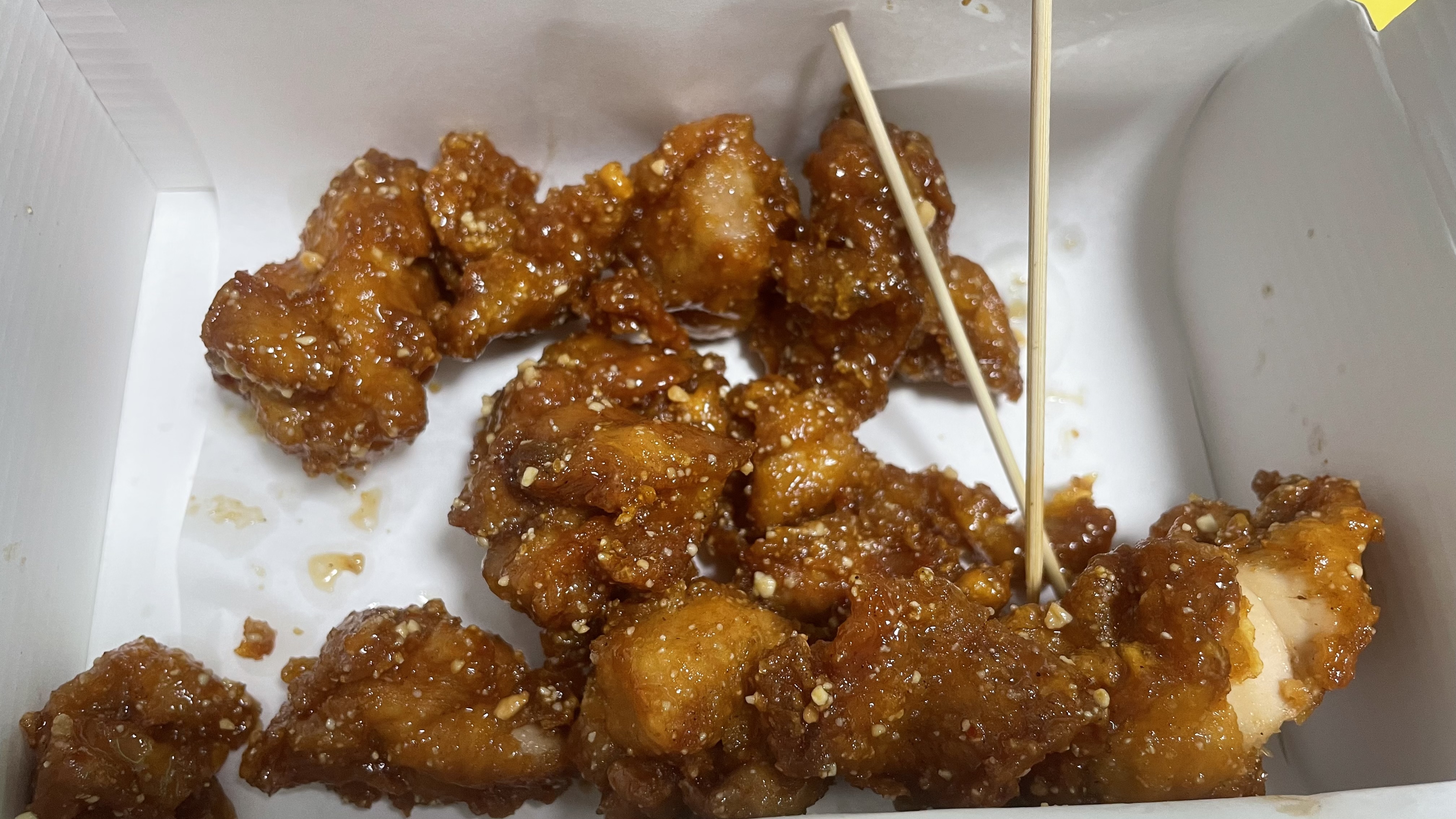 포장하고 숙소에 가는 길에 냄새의 유혹을 도저히 떨칠 수 없어 6점 정도 먹은 후 모습입니다. 닭강정의 맛은 겉이 정말 바싹합니다. 속은 닭다리살의 부드러움 아시죠?! 양념은 전체적으로 조청? 꿀? 같은 달달한 맛과 향기가 입안에 감돌아요. 남녀노소 불호 없이 맛있게 먹을 수 있겠더라구요.