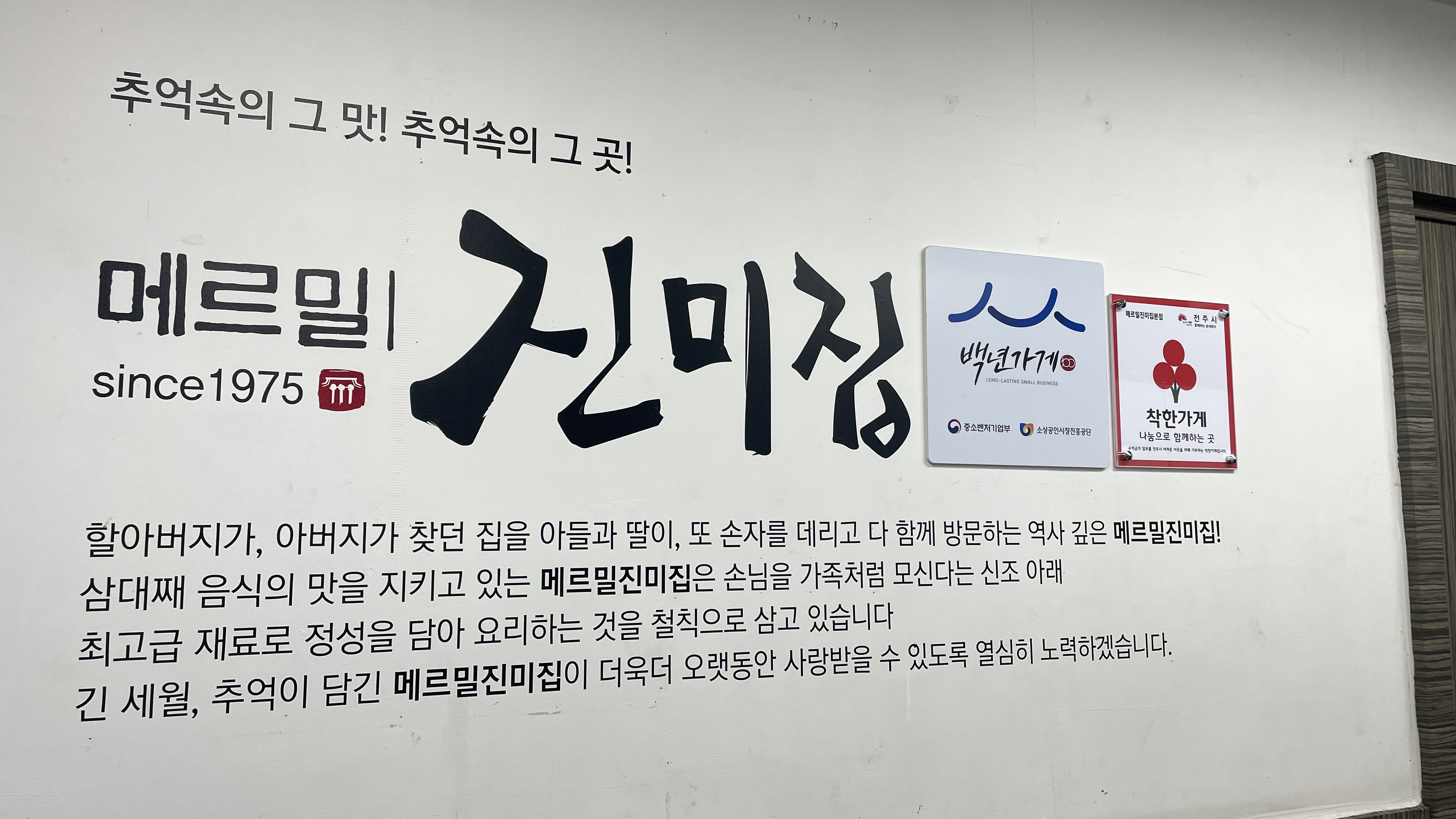 전주 한옥마을을 방문하신다면 '메르밀진미집'도 꼭 방문해보세요. 많은 맛집들이 있지만 한옥마을 관광단지가 개발되기 전부터 쭈욱 한자리를 지켜온 전통의 맛집 중 하나입니다. 고향이 전주이신 분들이라면 모를 수 없는 곳이에요. 저 역시도 진미집을 다닌지 어언 20년이 되어가는 곳입니다. 이제는 맛을 떠나 추억을 먹으러 가는 곳이 되었네요.^^