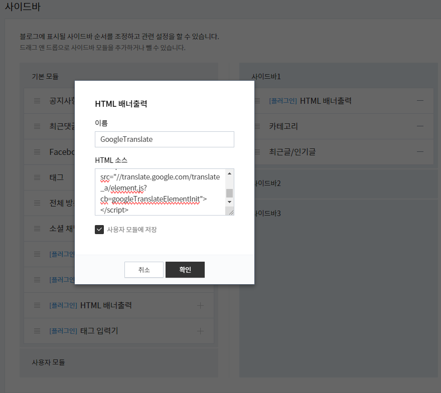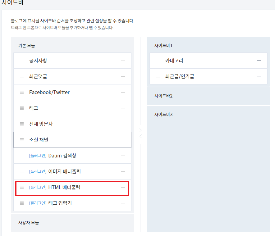 이제 사이드바 메뉴에 가셔서 HTML 배너출력 모듈을 활성화 시켜줘야 합니다. 사이드바에 들어가서 HTML 배너출력 모듈의 '+'를 클릭하여 자신이 원하는 사이드바에 활성화를 시켜줍니다.