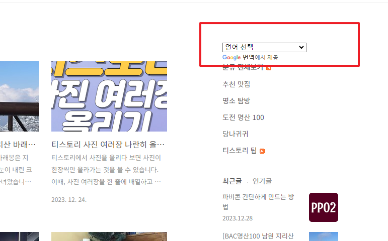 이제 모든 과정이 끝났습니다. 정말 간단하죠? 그럼 자신의 블로그에 번역기가 잘 적용되었는지 확인해보면 끝! 잘 적용되었다면 아래와 같이 언어 선택 탭이 보일겁니다.