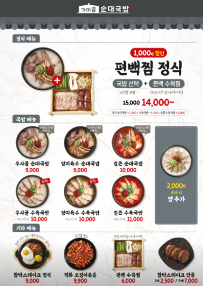 일단 순대국밥과 수육국밥을 주 메뉴로 전체적인 음식 가격이 비싸지 않습니다.
